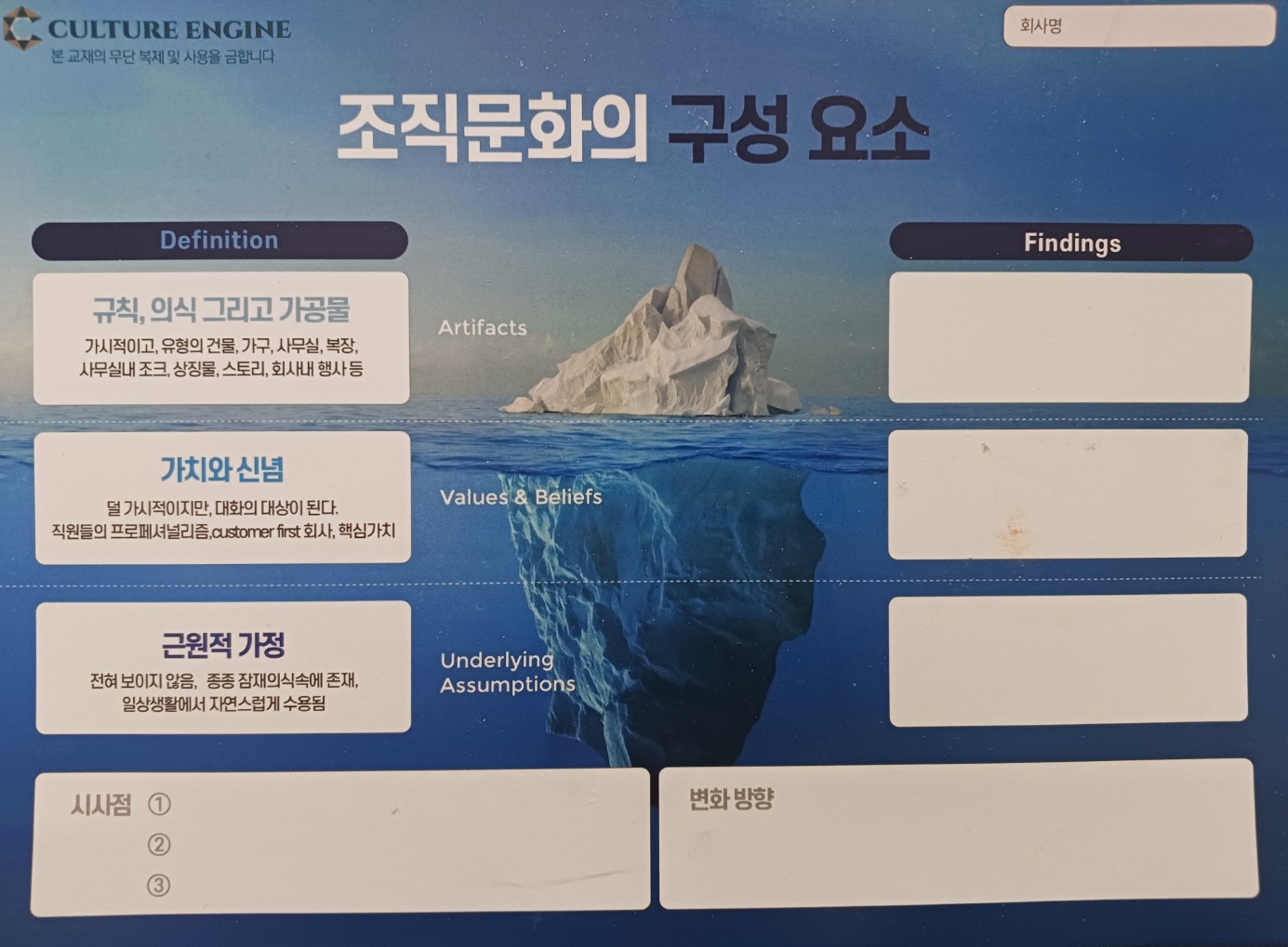 또하나, 이번 조직문화 교육을 통해서 깨달은 점은 조직문화의 구성요소 인데요.