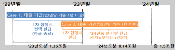 | * (Case1.) '23년말까지 이자를 납부한 기간이 1년 이상인 차주 : 이번 최초 집행시 환급 예정액 전액 환급 (환급종료) * (Case2.) 1년 미만인 차주 : 작년 납부한 이자분에 대해서는 최초 집행시 환급 및 올해(2024년) 납부하는 이자분에 대해서는 최대 1년까지 분기별로 환급 예정 |