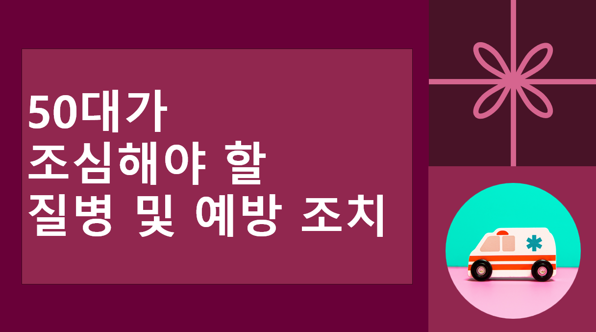 아직도 건강에 자신하고 있거나, 건강에 적신호가 켜진 50대 남성 분들께서는 조심해야 할 질병 및 어떻게 예방해야 하는지 간단한 정보를 공유하고자 합니다. 꼭 주의하셔서 건강한 노년을 맞이하시면 좋을 거 같습니다.